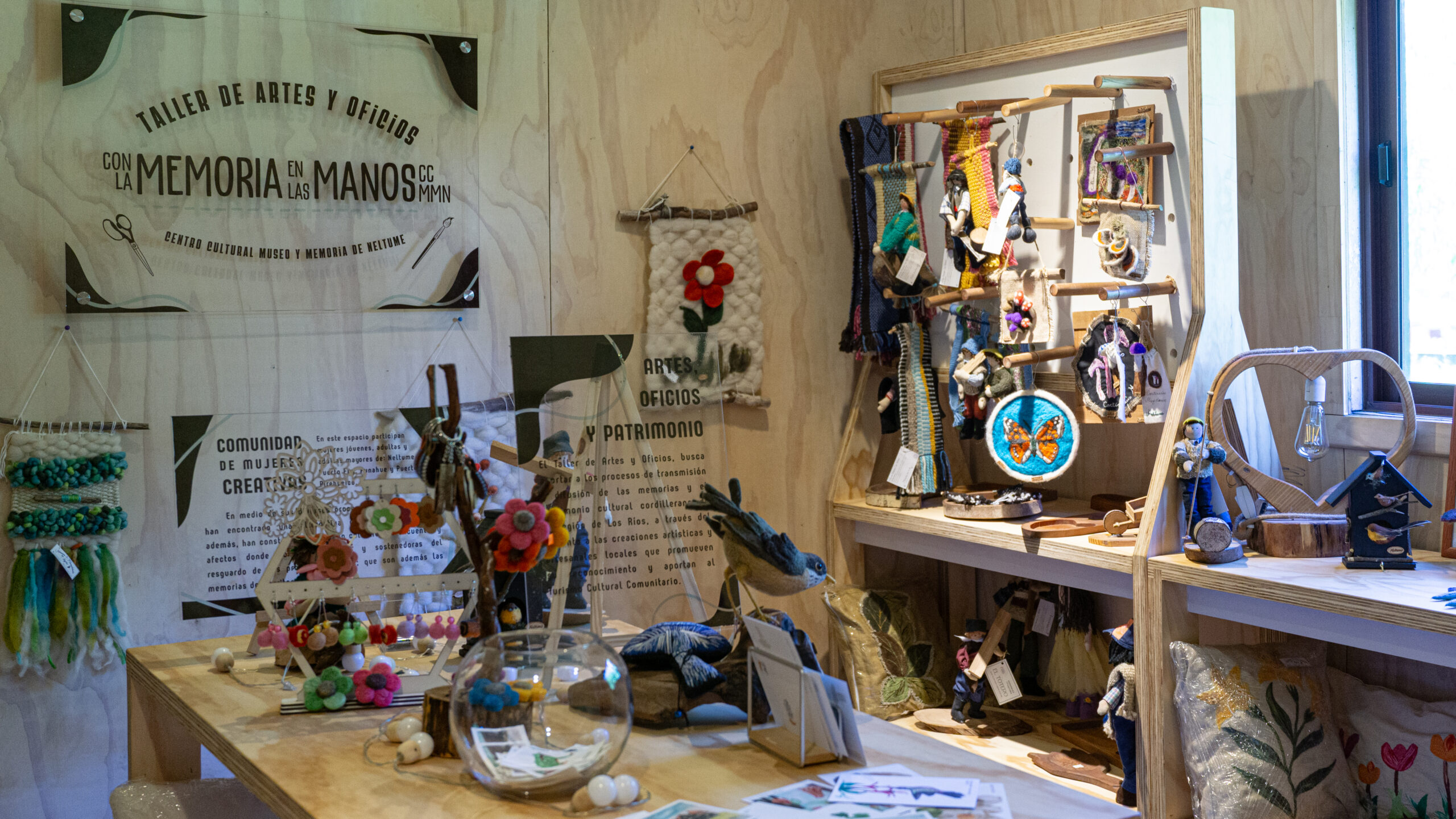 “Con la memoria en las manos” es un proyecto del Centro Cultural Museo y Memoria de Neltume (CCMMN), cuyo objetivo ha sido contribuir al fomento de la producción de artesanías locales hechas por mujeres de sectores rurales de la comuna de Panguipulli, a través de acciones de capacitación, promoción y comercialización de productos con identidad. La iniciativa incluyó el desarrollo de talleres intensivos y la implementación de un espacio permanente de exhibición y venta.